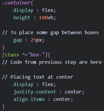 Please note that flex-grow and flex-shrink work on child classes. So, we will target all our boxes like this: